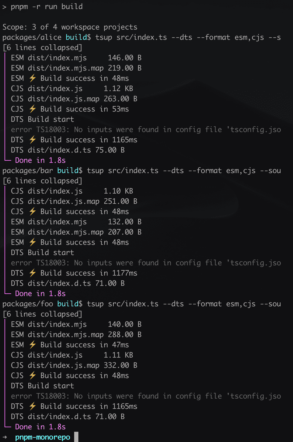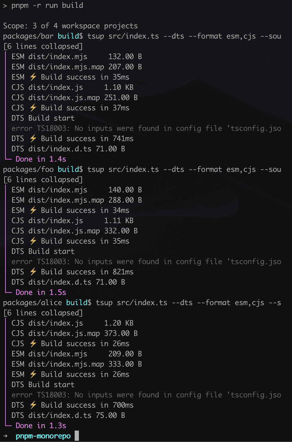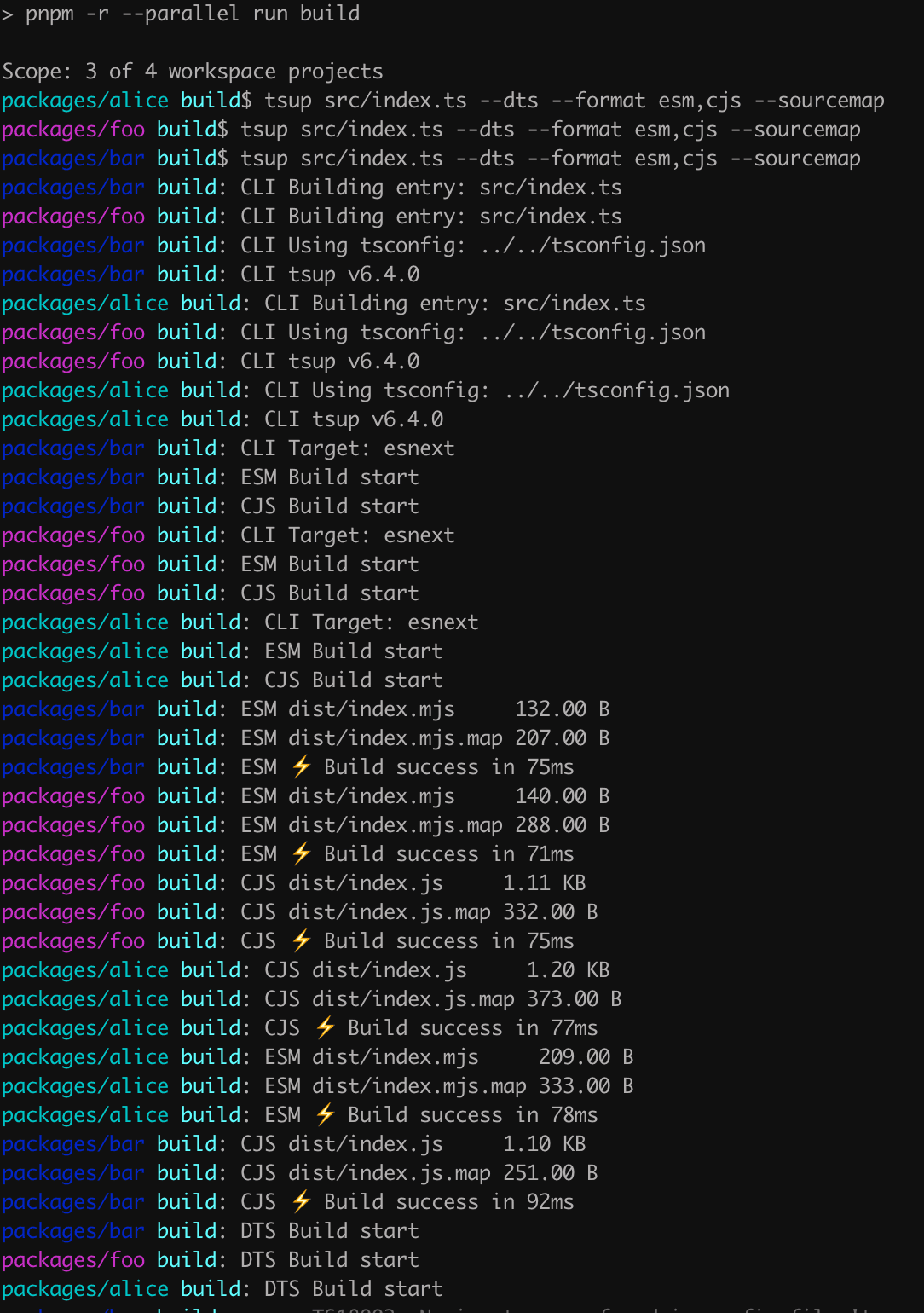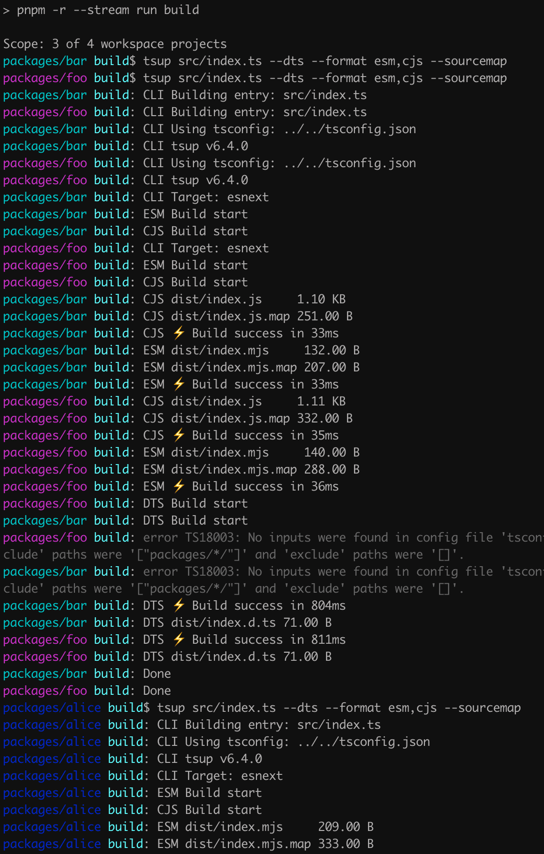 - 'packages/*'foo, bar, alice 是三个子包, 每个子包都是用 tsup 进行打包。然后,在根 package.json 中,需要 一个命令对所有子包进行构建