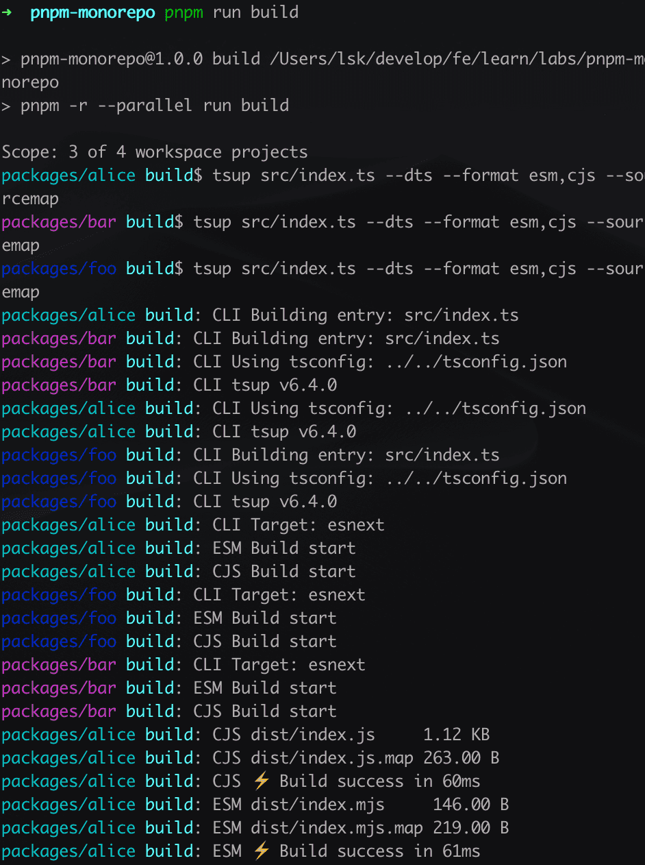 pnpm -F ...bar run build # 构建 bar和 alice 包